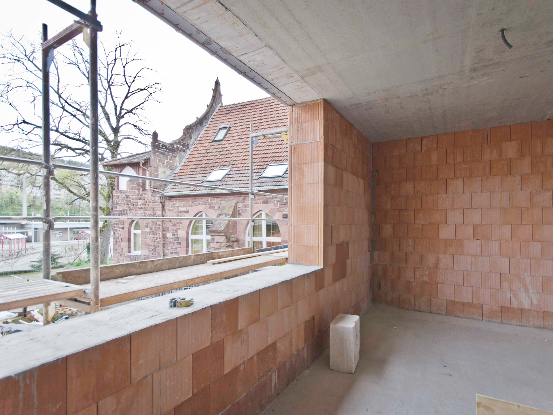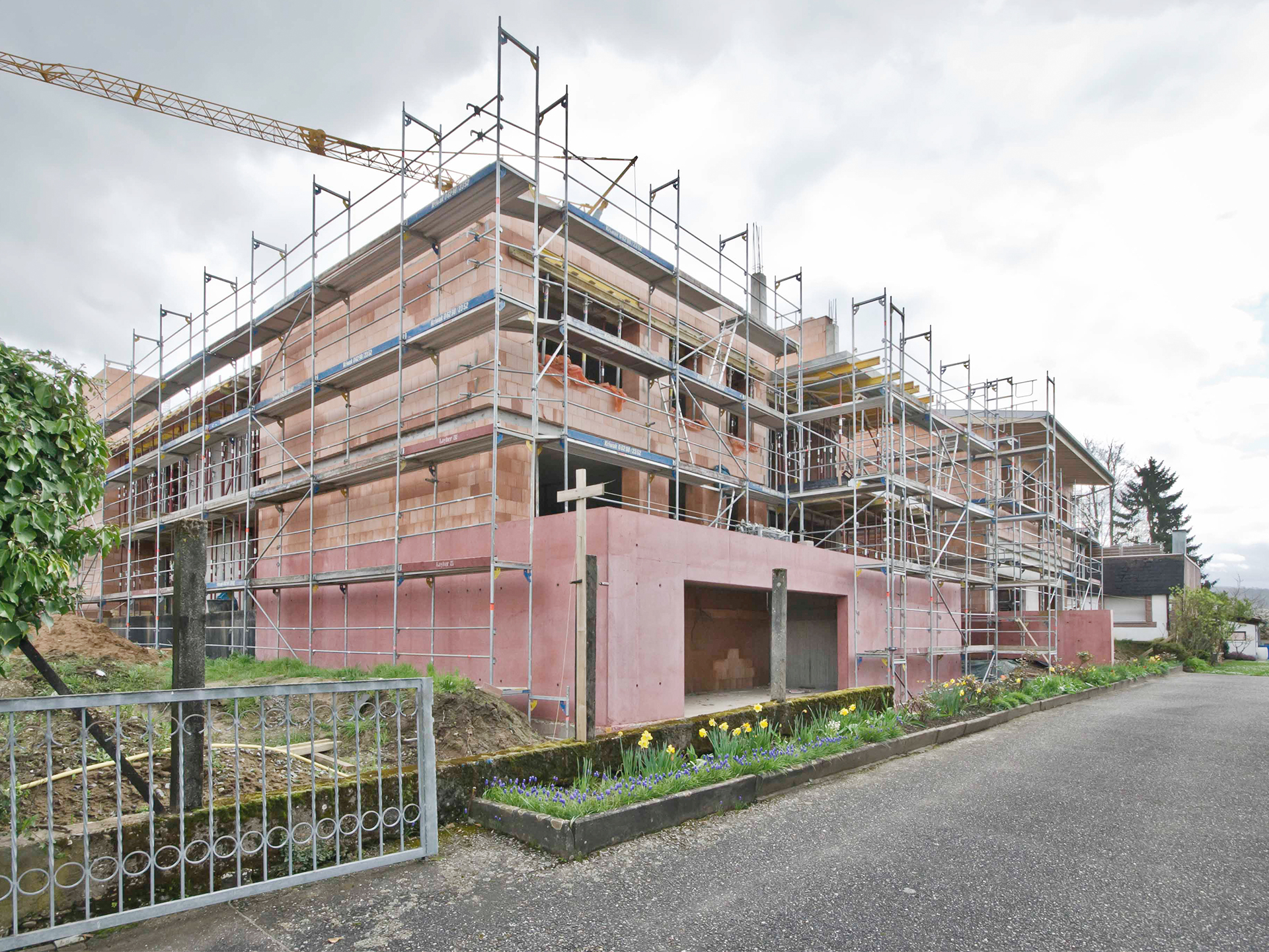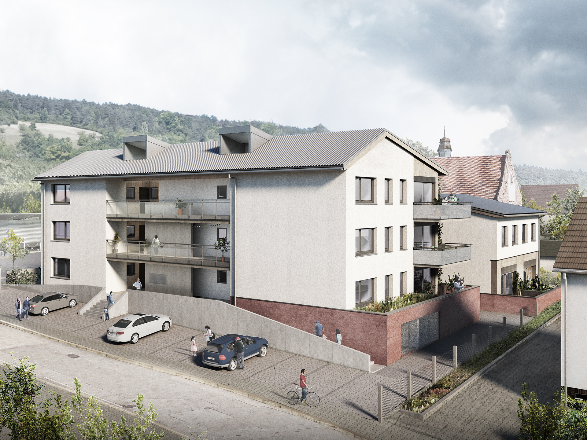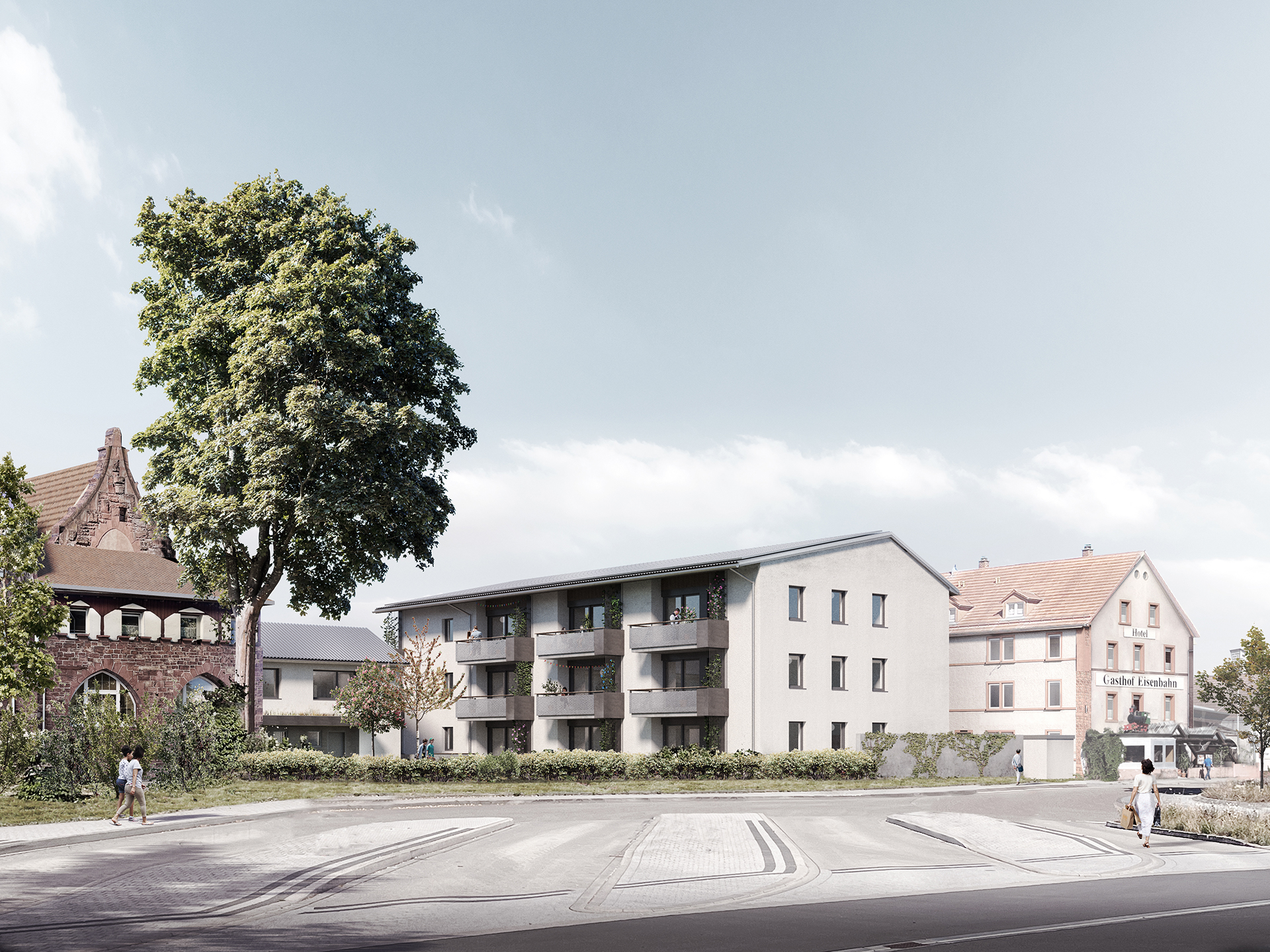 In direkter Nachbarschaft der denkmalgeschützten Klingenburg entstehen ingesamt zwölf Wohnungen in einem Mehrfamilien- und zwei Wohnungen in einem Doppelhaus. Die beiden neuen Häuser bilden zusammen mit der im Bestand vorhandenen und 2014 bereits zu einem Wohnhaus umgebauten Klingenburg und dem ehemaligen Postgebäude an der Bahnhofstraße ein Ensemble am Ortseingang von Mosbach-Neckarelz. In der Ausformulierung ihrer Fassaden und Dächer nehmen die beiden Häuser die wesentlichen Elemente der umliegenden Bebauung auf. Die Sockelzonen aus rot durchgefärbtem gestocktem Beton stellen den Bezug zum rötlichen Natursteinmauerwerk der benachbarten Klingenburg her. Beide Häuser werden mit einem monolithischen Mauerwerk und Dachkonstruktionen in Holzbauweise errichtet.