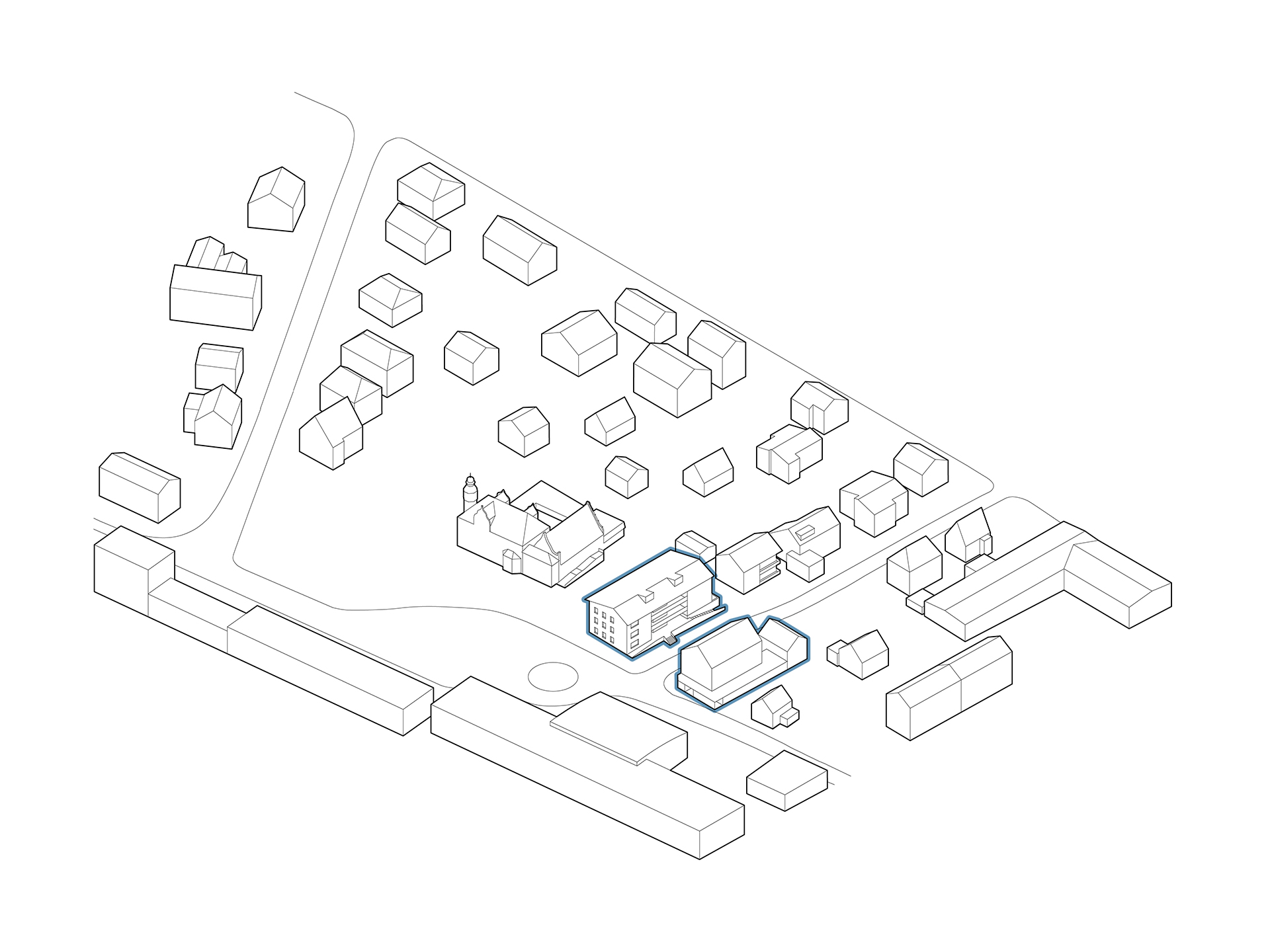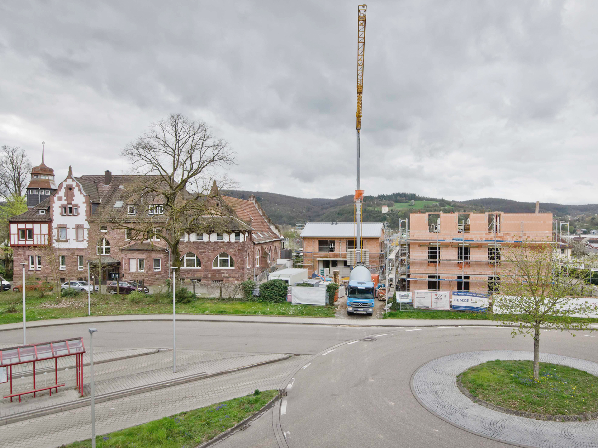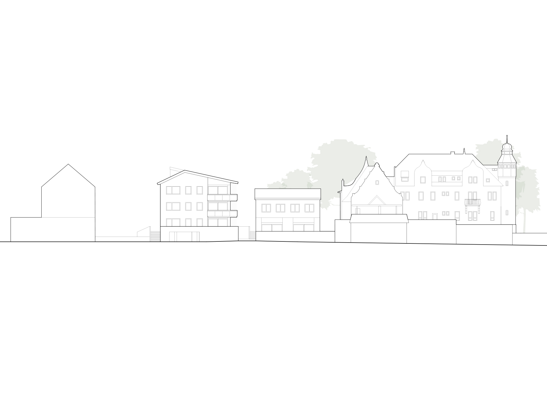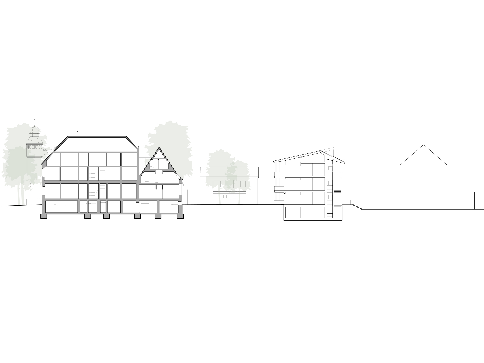 In direkter Nachbarschaft der denkmalgeschützten Klingenburg entstehen ingesamt zwölf Wohnungen in einem Mehrfamilien- und zwei Wohnungen in einem Doppelhaus. Die beiden neuen Häuser bilden zusammen mit der im Bestand vorhandenen und 2014 bereits zu einem Wohnhaus umgebauten Klingenburg und dem ehemaligen Postgebäude an der Bahnhofstraße ein Ensemble am Ortseingang von Mosbach-Neckarelz. In der Ausformulierung ihrer Fassaden und Dächer nehmen die beiden Häuser die wesentlichen Elemente der umliegenden Bebauung auf. Die Sockelzonen aus rot durchgefärbtem gestocktem Beton stellen den Bezug zum rötlichen Natursteinmauerwerk der benachbarten Klingenburg her. Beide Häuser werden mit einem monolithischen Mauerwerk und Dachkonstruktionen in Holzbauweise errichtet.