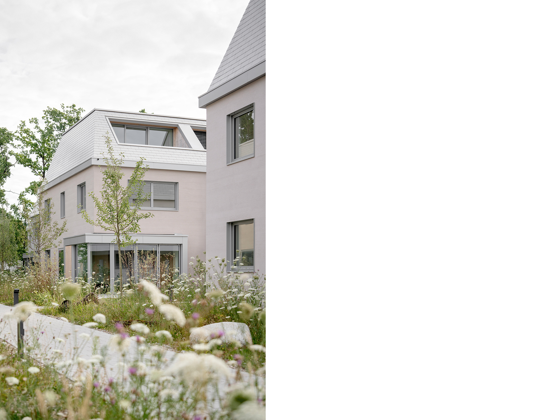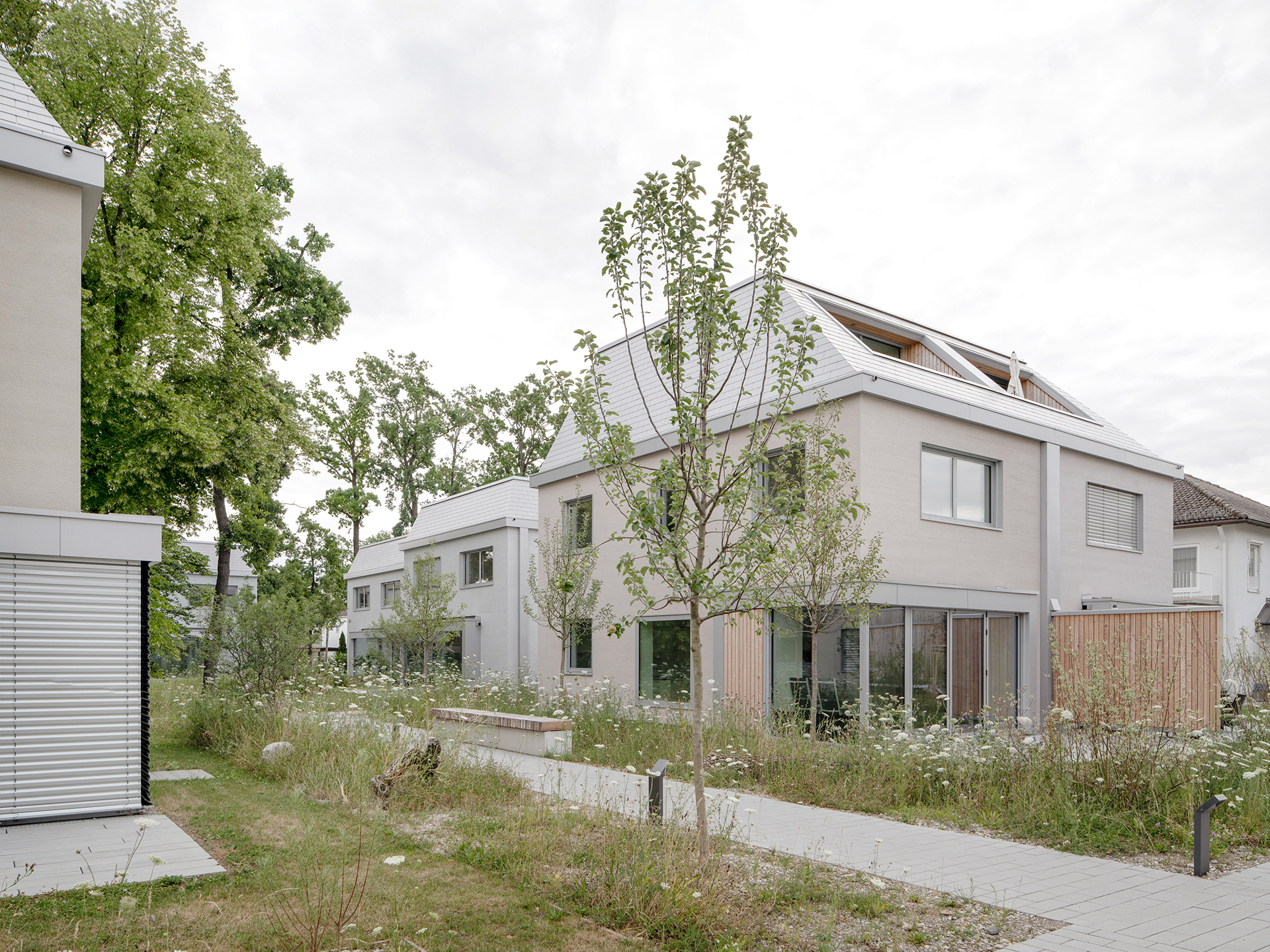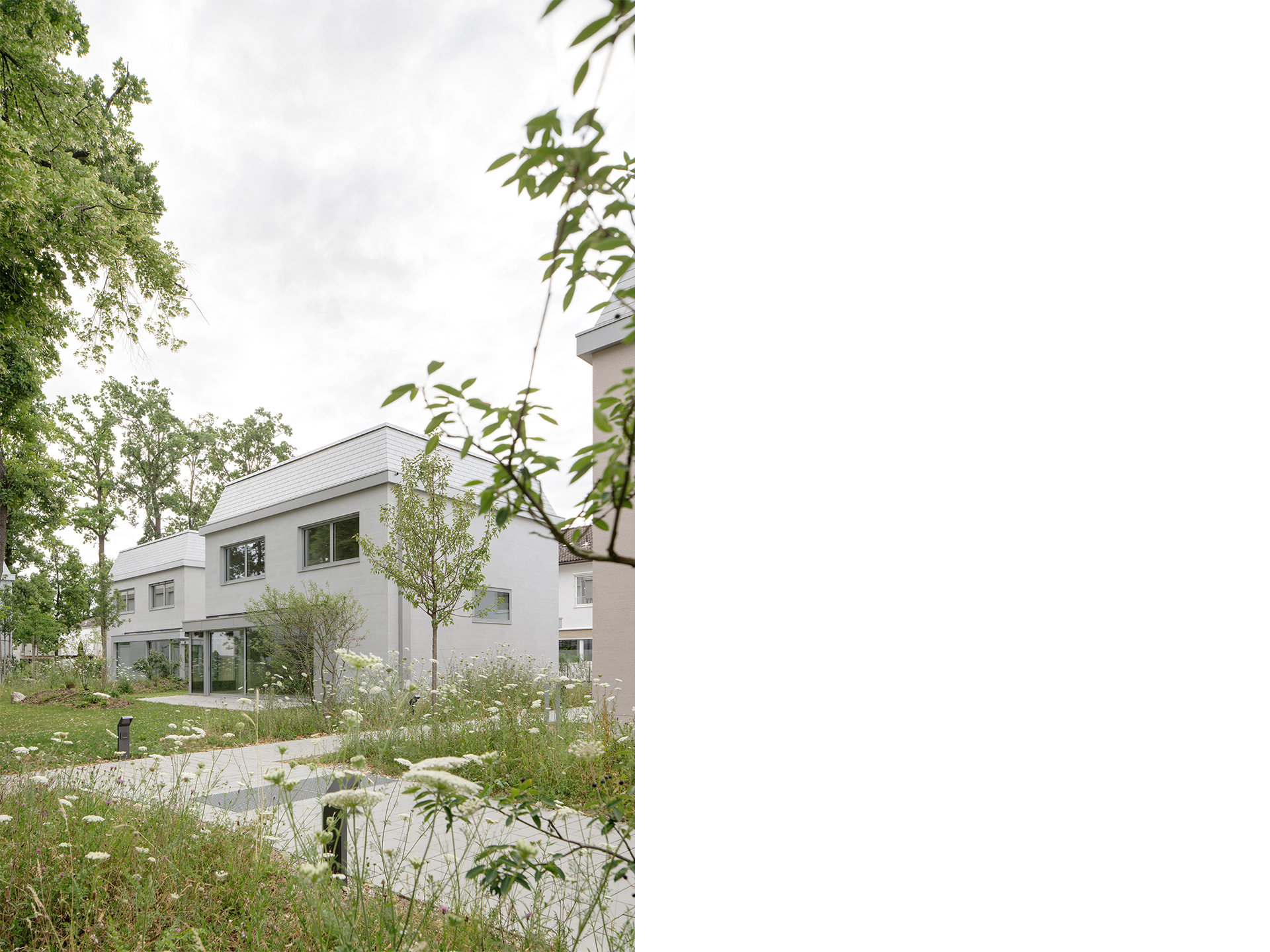 Die Anordnung der einzelnen Häuser erfolgt um die im Bestand vorhandenen Bäume herum in einem Verlauf ausgehend von den beiden Reihenhäusern am Rathausplatz über die Doppelhäuser in Grundstücksmitte bis zu den Einfamilienhäusern im hinteren Grundstücksteil, die lose um die schützenswerte Baumgruppe herum gruppiert werden und zu dieser hin ausgerichtet sind.