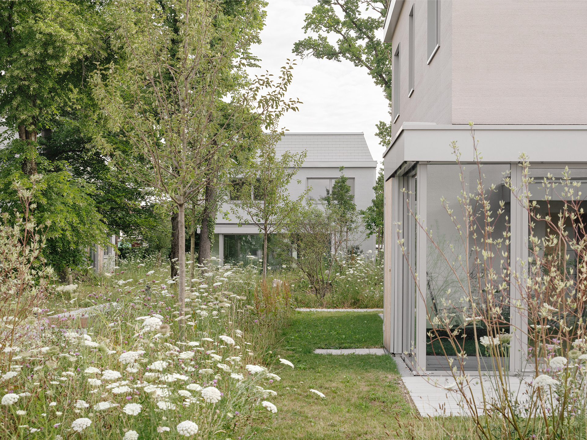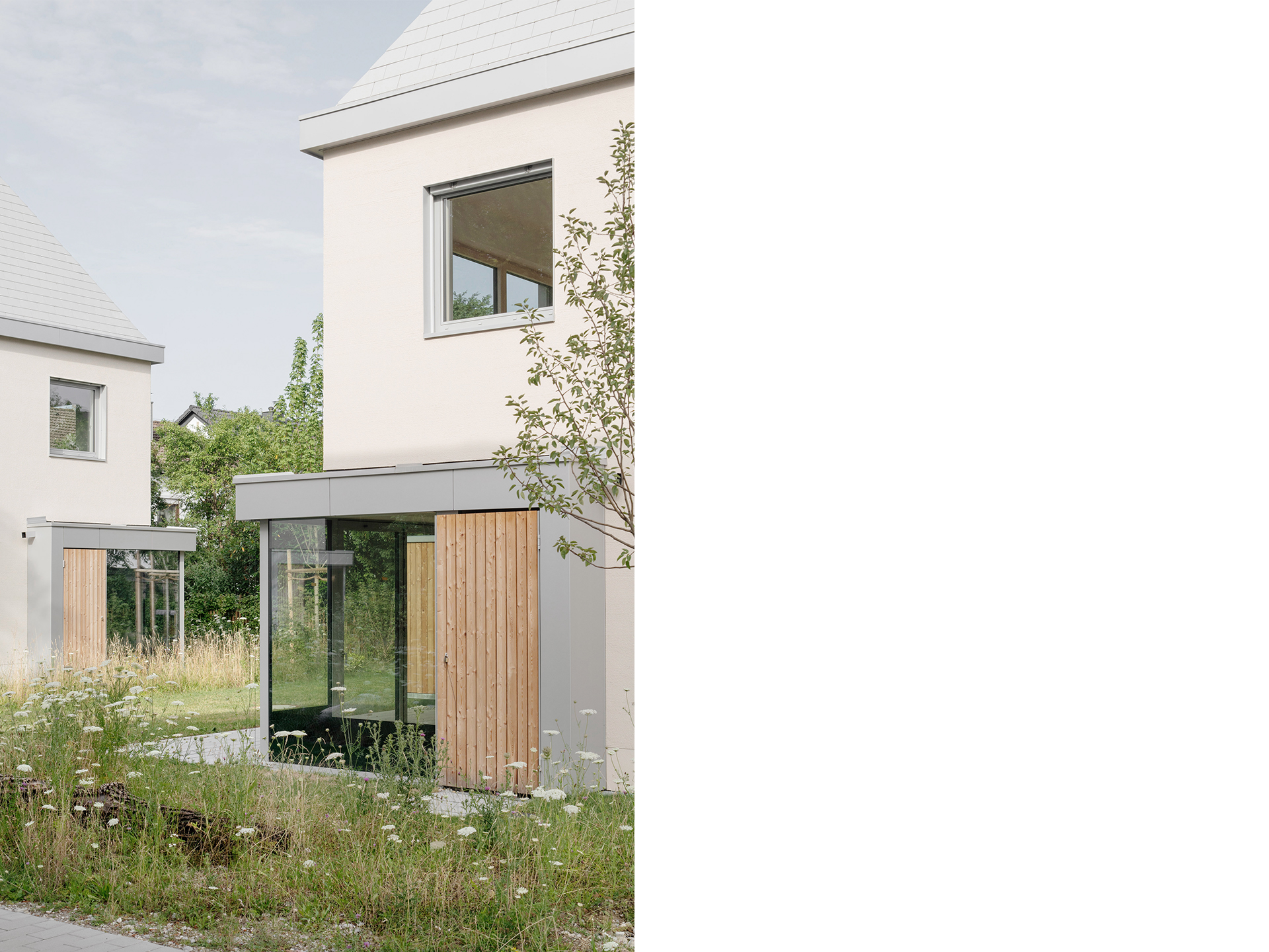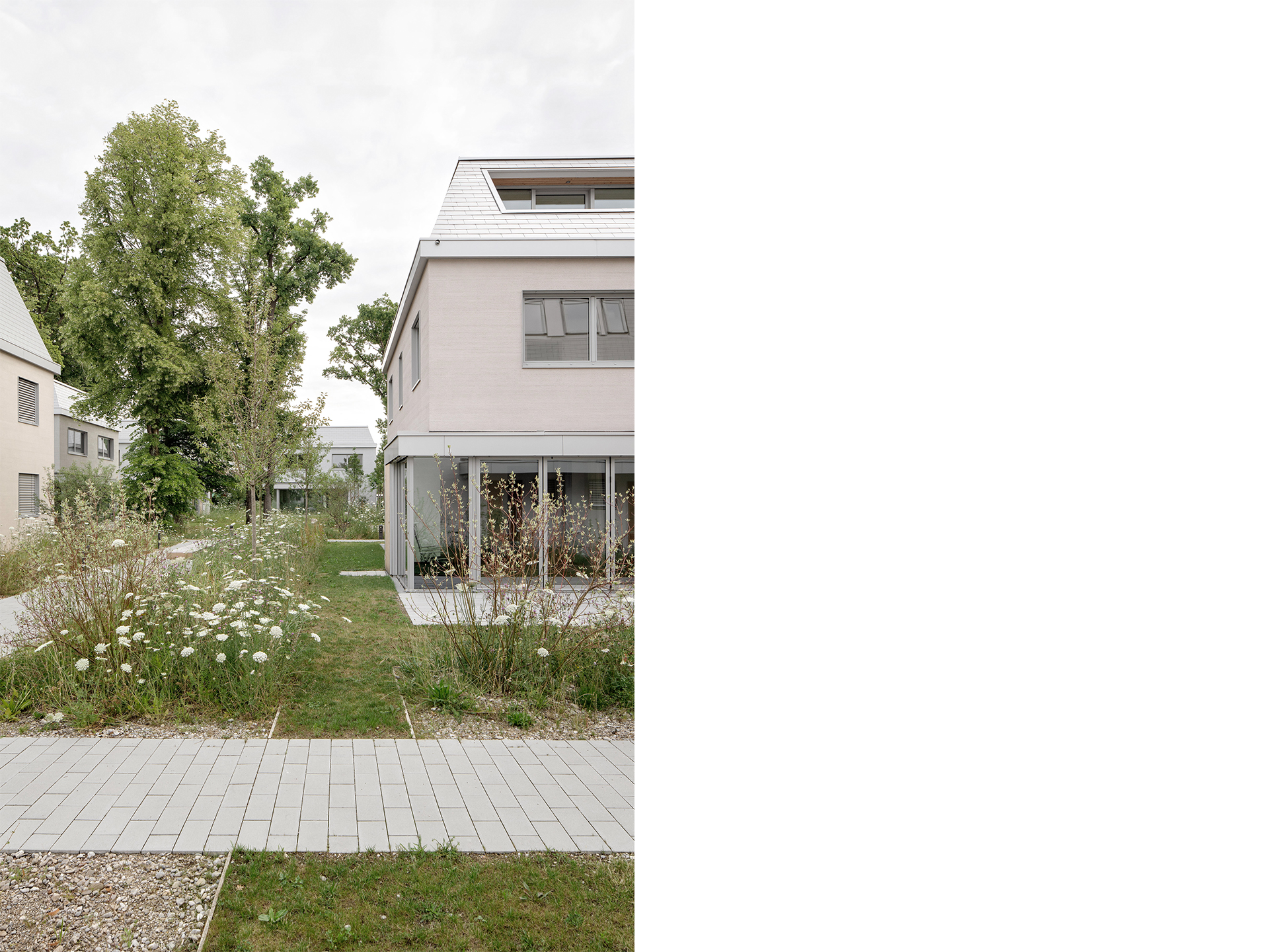 Die Anordnung der einzelnen Häuser erfolgt um die im Bestand vorhandenen Bäume herum in einem Verlauf ausgehend von den beiden Reihenhäusern am Rathausplatz über die Doppelhäuser in Grundstücksmitte bis zu den Einfamilienhäusern im hinteren Grundstücksteil, die lose um die schützenswerte Baumgruppe herum gruppiert werden und zu dieser hin ausgerichtet sind.